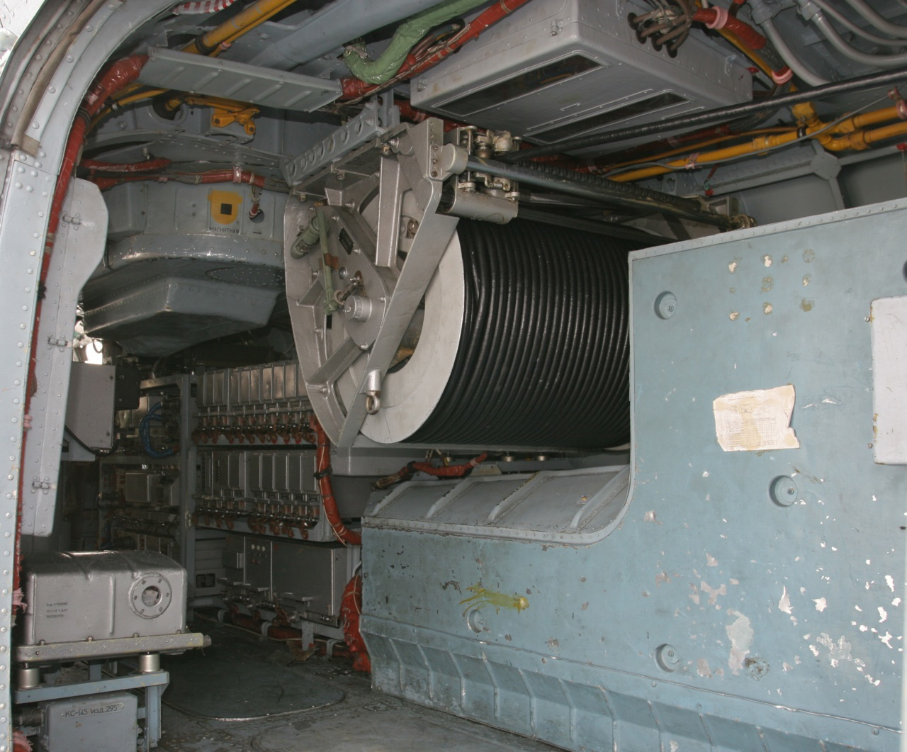 У Ка-27ПЛ грузовой кабины практически нет :)) поэтому и фоток нет. Вот фотка барабана с кабельтросом, справа от двери две стойки с блоками аппаратуры с небольшим проходом между ними. Моряки это место просят не фотографировать, я к их просьбе прислушиваюсь..