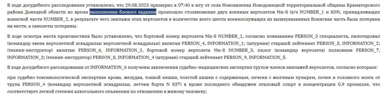 «…29.08.2023 года, примерно в 07 часов 40 минут, к югу от поселка Новоявленка Новодонецкой территориальной общины Краматорского района Донецкой области, при направлении для выполнения боевой задачи произошло столкновение между двумя военными вертолётами Ми-8 (б/н 837 и 839), <…> у пятерых из шести членов экипажа перед гибелью зафиксировано наличие алкоголя в крови и/или внутренних органах».