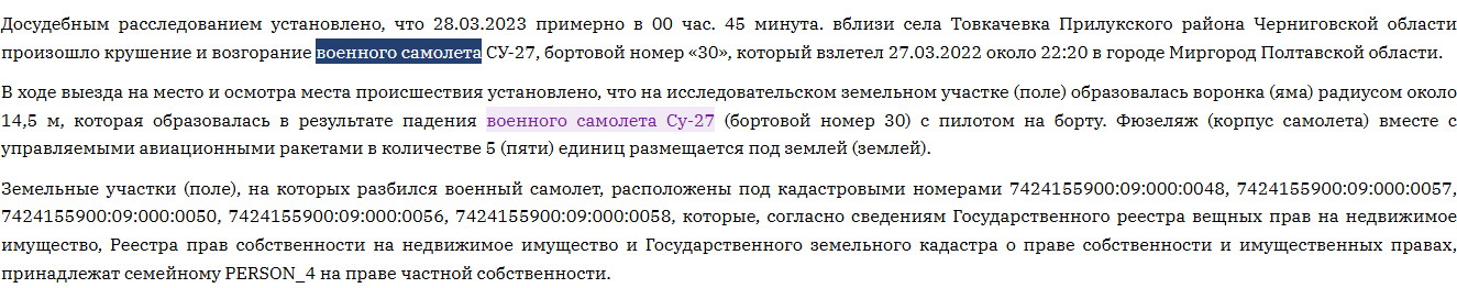 30.04.2022 в ході огляду місця події ділянки місцевості, що знаходиться поблизу смт Нова Прага, Олександрійського району Кіровоградської області, де сталася авіакатастрофа, було виявлено та вилучено: бойовий бомбардувальник СУ-24М, бортовий N НОМЕР_1 та його уламки, реєстратор польотних даних 2Т-3М N 0640614, 1 катушку зі звуконосієм N НОМЕР_4, авіаційна пушка ГШ-6-23М N НОМЕР_2.