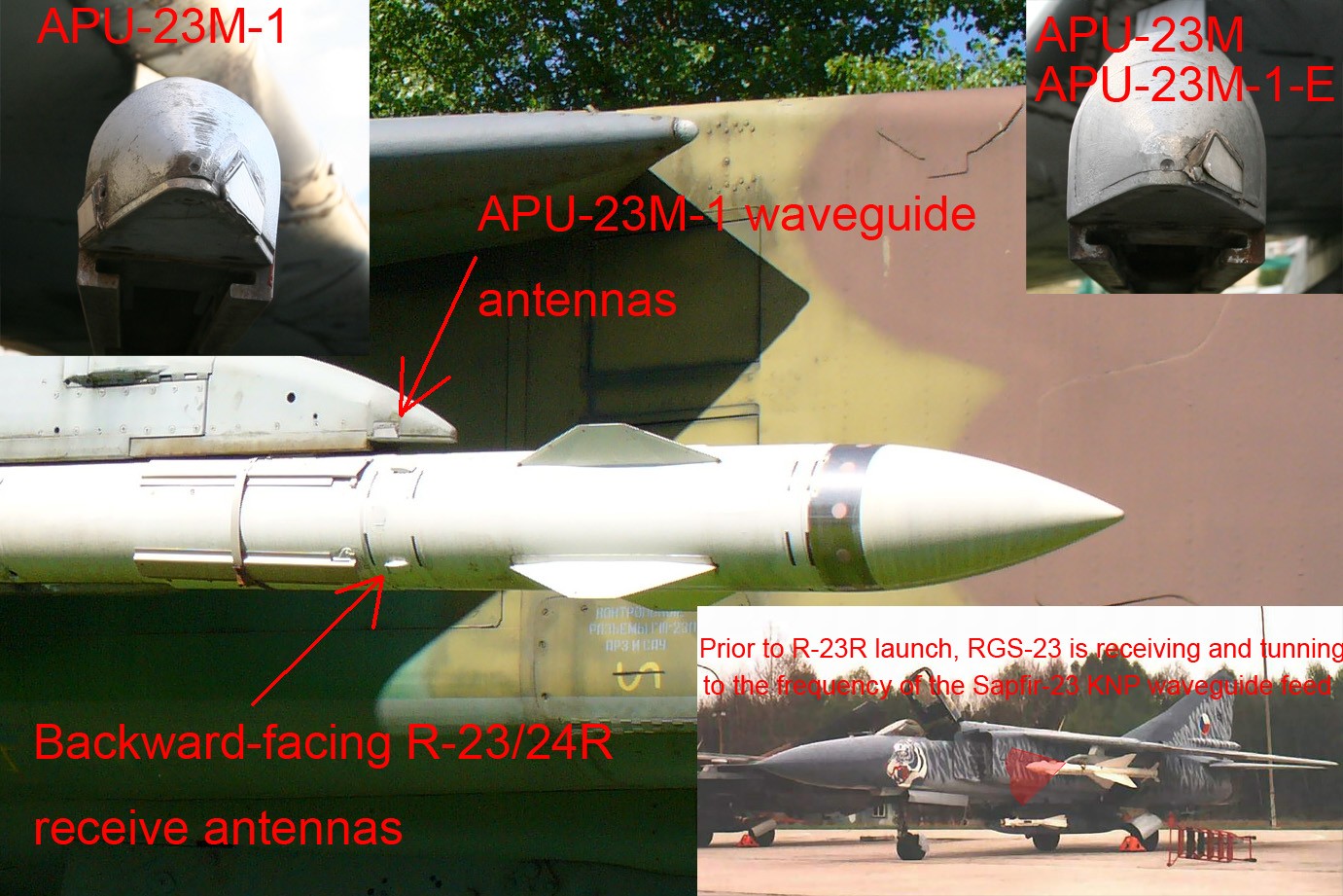 Совершенно верно, но интересно есть что на експорт для стран Варшавского договора выпускали установку с обозначением АПУ-23М1-Е с единственным волноводом. Например первые Миг-23МЛ которые мы получили в 1981 имеели только АПУ-23М1-Е. Самолеты Миг-23МЛ поздних серий (поставка 1983) были уже оснащены более совершеной версии установки АПУ-23М1, но у нас ракеты Р-24Р никогда небыли использованы.
