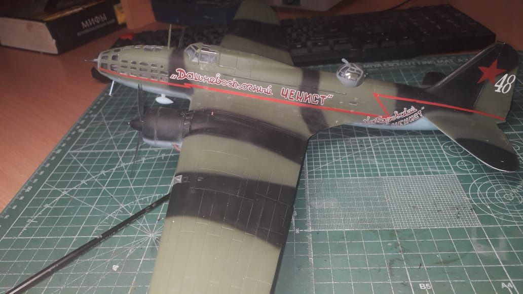 Просто хорошая работа одного из друзей, вполне подходящая для 9 мая. Ил-4 (ДБ-3) в 48-м масштабе. Реальный борт, 4 февраля 1943 года перелетел с нашего завода на аэродром Хурба, 24 марта совершил первый боевой вылет. 15 мая того же года не вернулся с боевого задания... https://m.vk.com/wall-124542095_535?...80%D0%B1%D0%B0