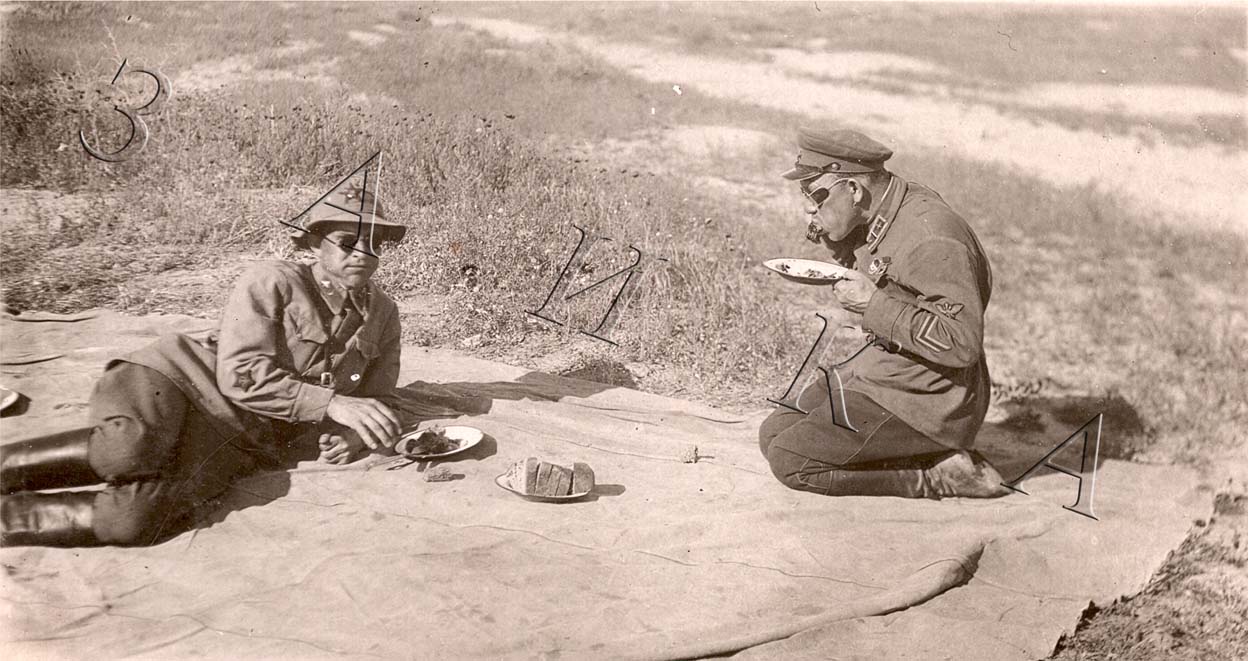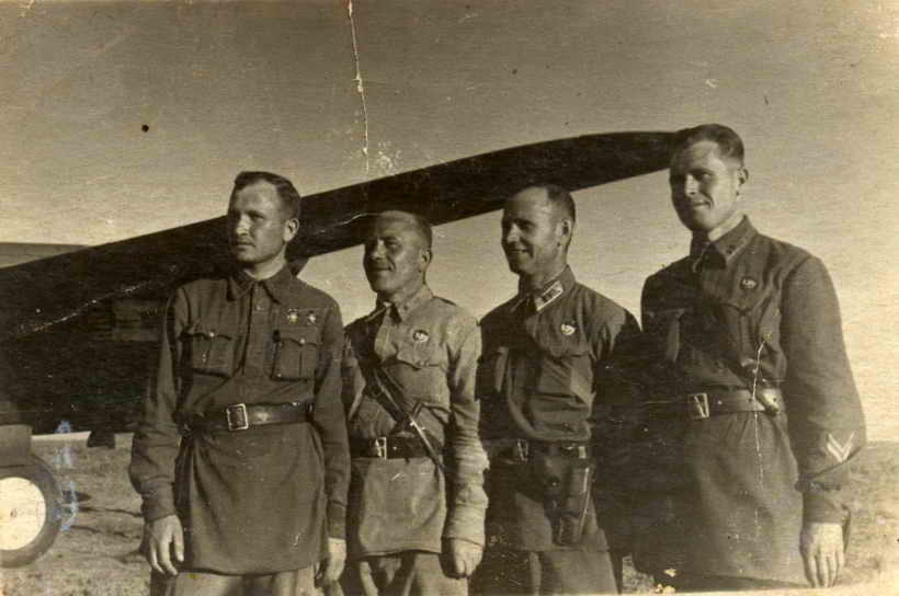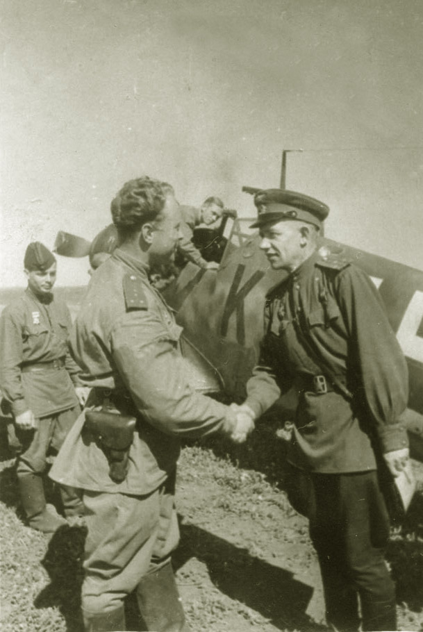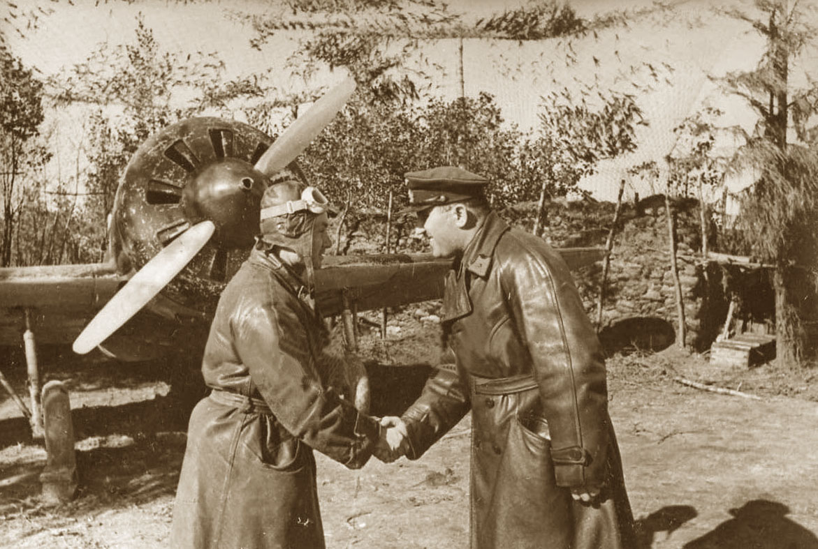 5 комиссар части Шаншанашвили благодарит лётчика, ГСС капитана Миронова за удачный боевой вылет. 1941 год.