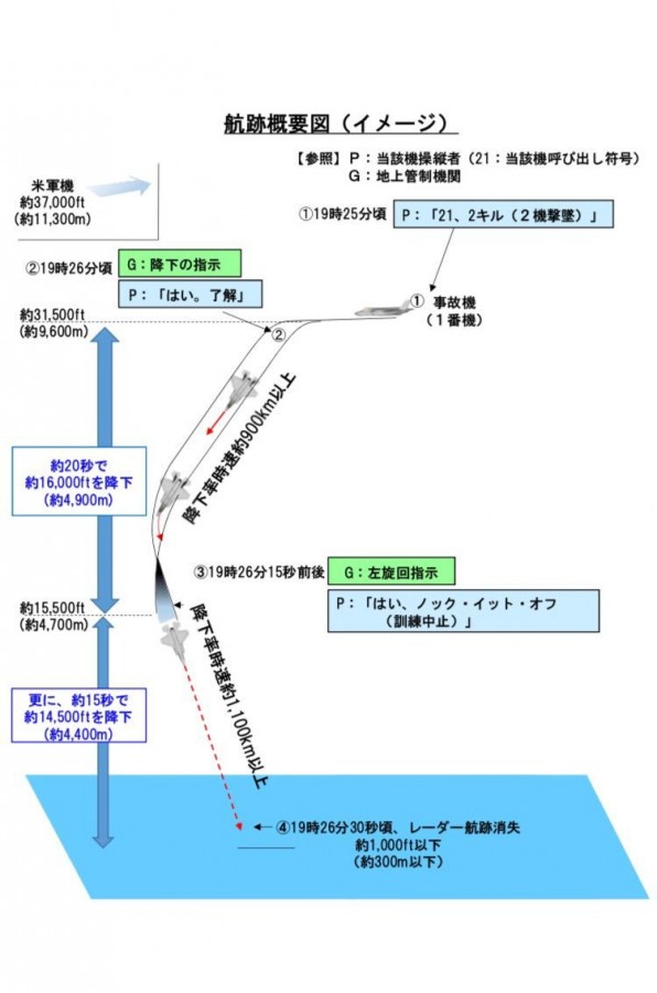 По имеющимся данным, F-35 вошел в воду на скорости около 1100 километров в час, пилот не предпринял попытки катапультироваться. В ходе расследования выдвигалась версия, что пилот истребителя мог потерять управления из-за кислородного голодания, но японские военные опровергли это предположение "