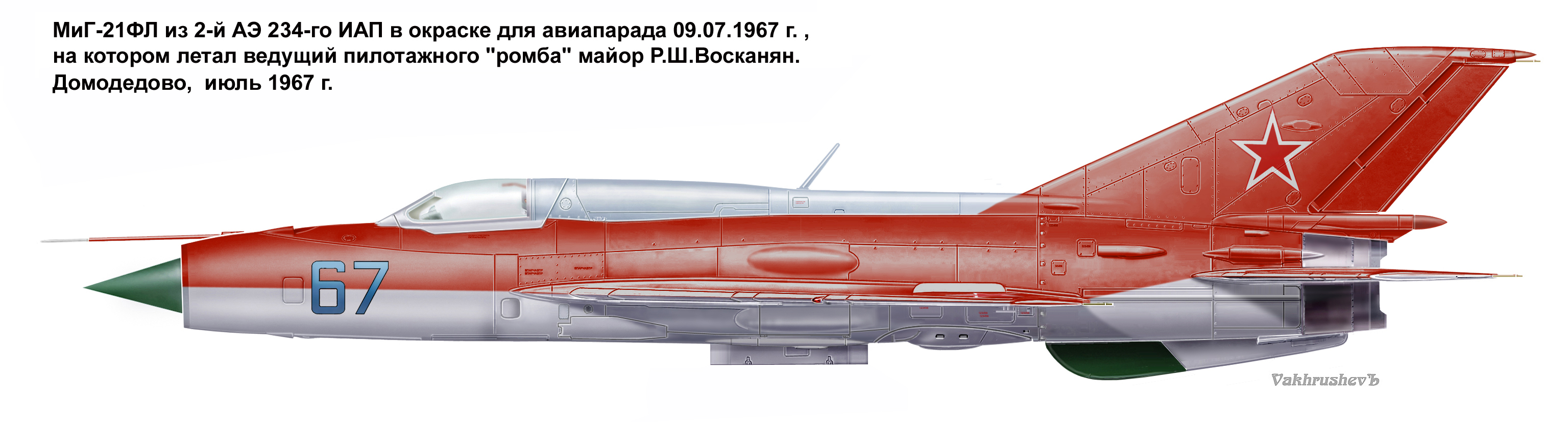 Этот аппарат - МиГ-21ПФС поздних серий, изделие "94" - с середины 80-х, как многим, наверное. известно, простоял на открытой стоянке музея ВВС МВО в авиагарнизоне Кубинка, претерпев несколько вольных перекрасок. За прошедшие годы руками "наследников боевой и трудовой славы" своих отцов и дедов, как и весь некогда очень приличный музей, был доведен до почти полной деструкции. Руками энтузиастов-любителей при поддержке командования ЦПАТ недавно был восстановлен и выставлен на ретро-линейке аэродрома рядом со своими "собратьями" по несчастью. На самолете воспроизведена окраска одного из МиГ-21ФЛ 2-й АЭ 234-го ГИАП, принимавшего участие в воздушном параде 1967 г. в Домодедово в составе "ромба" командира 2-й АЭ майора Р.Ш. Восканяна (пилотажных групп в то время в полку еще не существовало). Самолеты очень похожи и отличаются визуально признаками присутствия системы СПС (на ФЛ ее не было).