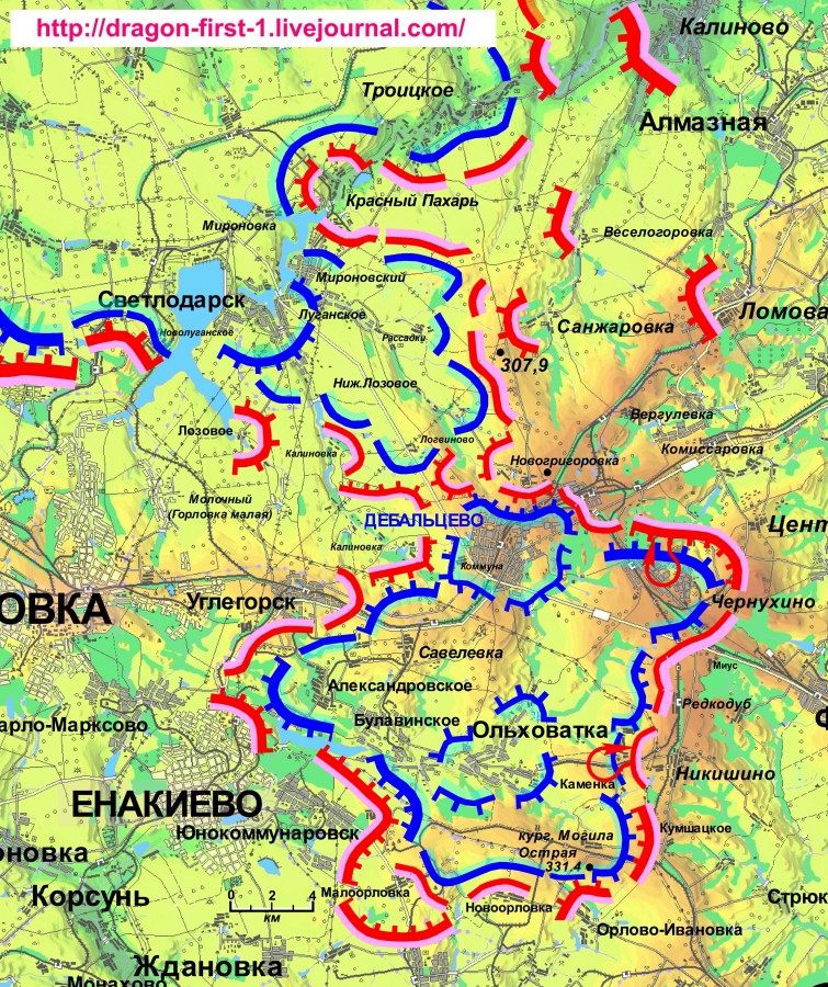 Наши выкатились к Логвиново, судя по всему со стороны Калиновки, где после взятия Углегорска, оборона хунты отчетливо начала прогибаться. Для того, чтобы вы понимали прогресс наступления в районе Дебальцево, взгляните на карту Дебальцевского выступа до взятия Углегорска, что открыло нам новые возможности после неудачных попыток замкнуть кольцо окружения в районе Светлодарска. Что удивительно, как и в случае с Углегорском противник проморгал наши действия, причем вызывает недоумение, что этот критически важный для снабжение многотысячной группировки населенный пункт не был должным образом укреплен и его оказалось возможным занять групой мотопехоты с одним танком. Какой-то верх безалаберности. Если хунта потерпит неудачи в боях под Логвиново и Калиновкой, то уже в ближайшие пару дней стоит ожидать выдвижения механизированных резервов со стороны Артемовска для деблокады Дебальцевской группировки.