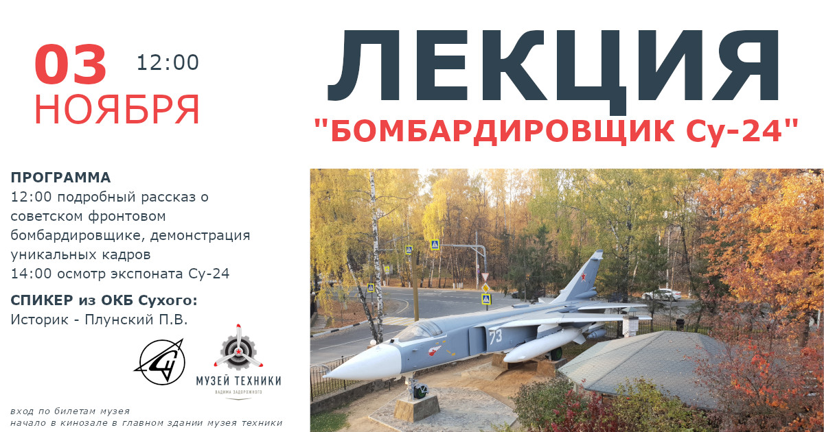 Музей техники Вадима Задорожного приглашает любителей авиации на лекцию, посвященную советскому фронтовому бомбардировщику Су-24. Лекцию будет читать профессионал ОКБ Сухого - Историк - Плунский П.В.