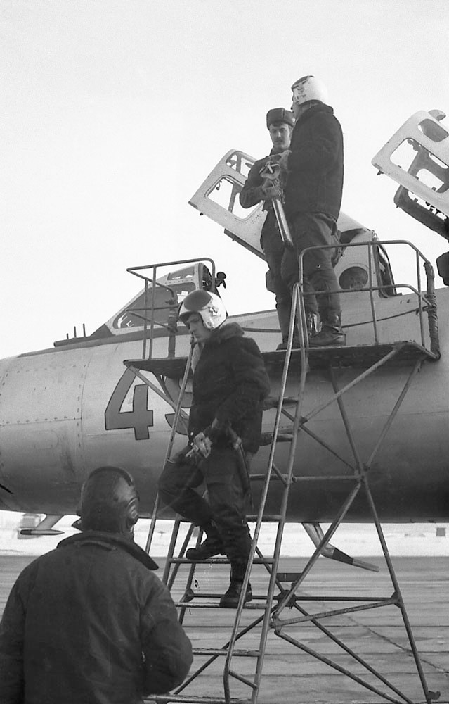 на фото самолет 356 ап 3 аэ (ею командовал МАО) фото примерно 80-81г: слева на право штурман П.Завалий, Ком.кор-ы В.Агеев, А.Максимов, В.Мишин, В.Сафоновский, В.Арюхов, В. Лазарев. Самолет в 81 или 82г передали в Белую. У меня на нем самопроизвольно выпускались интерцепторы в полете при том ночью, ощущалось это по тому как самолет вел себя не адекватно, просто приходилось включать форсаж для поддержания скорости, это потом мне техник рассказал через какое-то время. Техника кстати на 31 засосало в двигатель, неудачно проходил под нижним срезом СВЗ и в кабине находился один из летчиков с этого снимка. Самолет в последствии был потерян в 350 ап, не выживали там самолеты с №4Х. Да и фото по моему я делал.