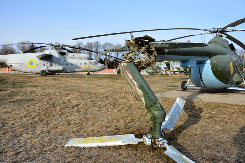 Автор фото датирует его февралем 2015 года.Говорит что это последствия летней атаки на Конотоп...смущает только Ми-6-он как раз обращен к камере пострадавшим бортом.