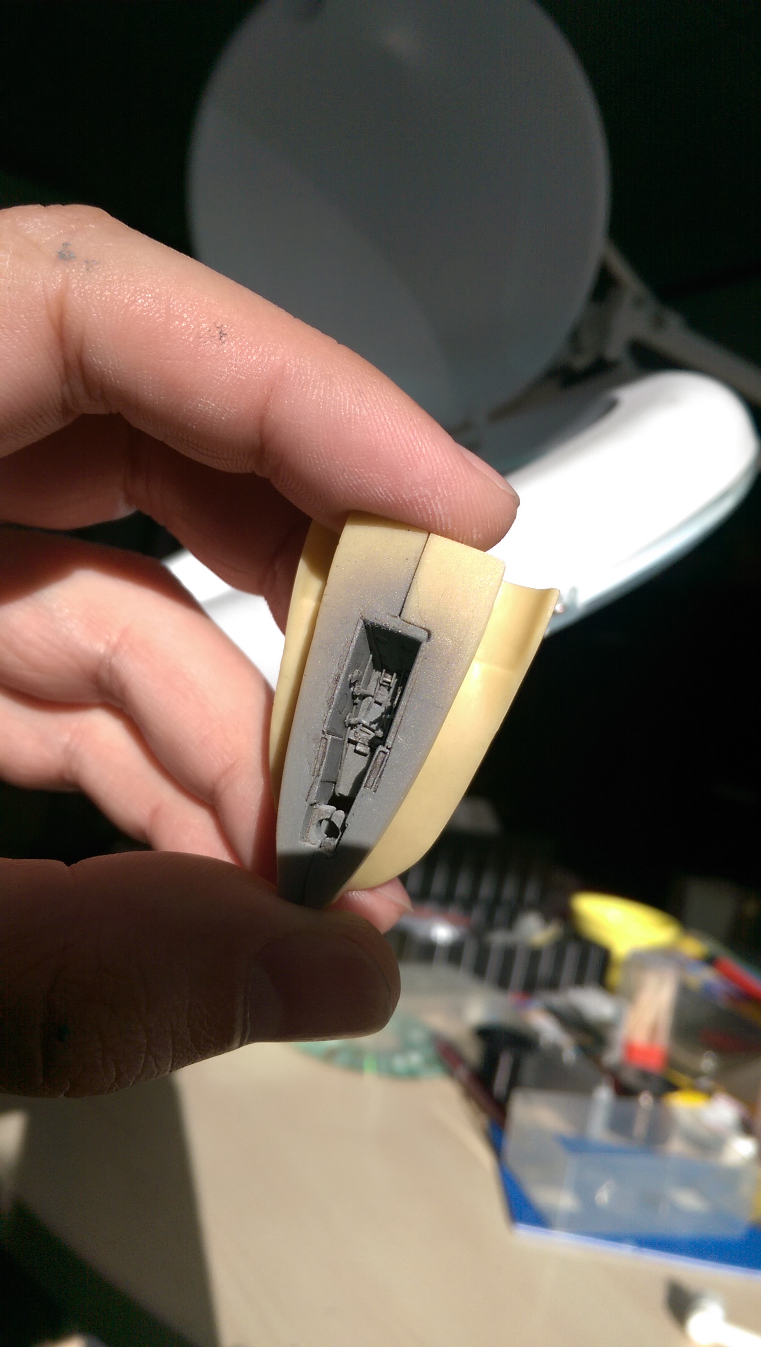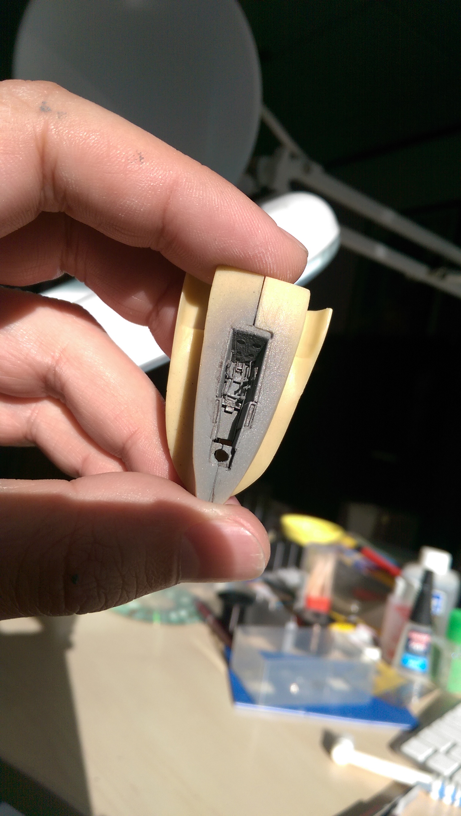 После долгих примерок и притерок вклеил кабину пилота и склеил половинки фюзеляжа. Задул швы грунтом, завтра буду зачищать. Жалко некоторые панели за кабиной сотрутся в ноль.