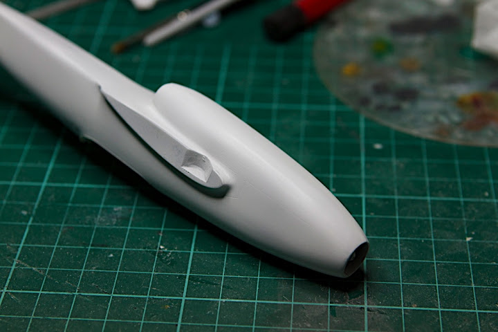 По модели - просто вылизывал швы на фюзеляже пару дней. До сопла пока не добирался, проблема в том, что конус отклеился после того как я его случайно задел пилкой и провалился внутрь фюзеляжа.