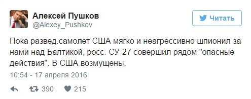 Дополнительное внимание США уделяют случившемуся в связи с тем, что незадолго до этого имели место "небезопасные", по мнению Вашингтона, "контакты россиян с американским военным кораблем Donald Cook на Балтике, отметил представитель Пентагона. Кроме того, продолжал представитель военного ведомства, с точки зрения США, "в прошлом году неоднократно происходили инциденты, при которых российские военные самолеты настолько сближались с (американскими) летательными аппаратами или кораблями, что вызывало серьезную обеспокоенность по поводу безопасности". "И мы чрезвычайно озабочены любым таким поведением", - подчеркнул представитель Пентагона.