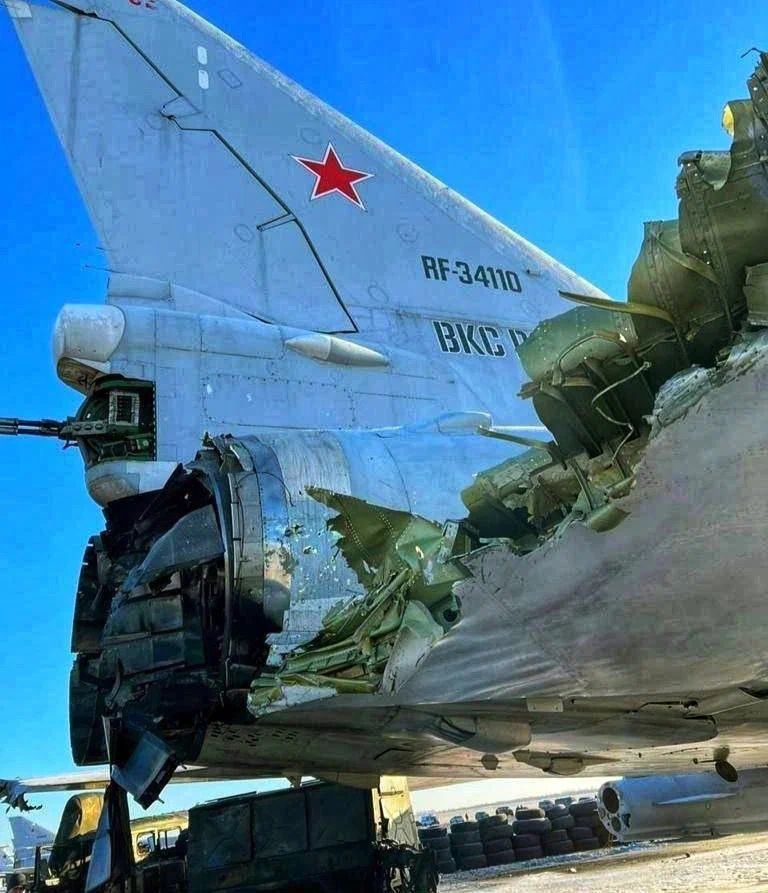 По фото видно о повреждении того же Ту-22 Дягилево. Повреждён двигатель. Разве Россия сейчас производит эти двигатели, чтобы вернуть в строй этот самолёт? Что там с Ту-95 непонятно. Сегодня наши военкоры перепостили американские фото по Энгельсу. Выше я написал предупреждение по поводу фейков по данному факту, инфа требует проверки и подтверждения, так как это инфа от врага. Фотошоп это или нет – требует проверки, но для общей информации. Видим место попадания и взрыва и залитый пожарной пеной Ту-95. Он повреждён? По официальному заявлению МО РФ - то да...
