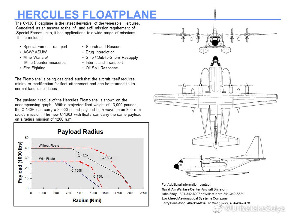 Самолёт Lockheed C-130 Hercules совершил свой первый полёт в 1954 году, а двумя годами позже поступил в ВВС США. За более чем полувековую историю разработаны десятки модификаций C-130, которые активно эксплуатируются в шестнадцати странах. Кроме того, Lockheed C-130 Hercules является самым распространённым военно-транспортным самолётом в мире. В 60-е годы компания Lockheed уже работала над амфибийной версией C-130 Hercules, но дальше опытных образцов проект не продвинулся.".